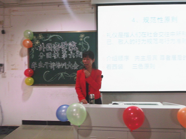 活动最后一项,黄丽芹书记做开班讲话并进行第一讲:员工干部常用礼仪。黄丽芹书记指出,各干部身为“领头羊”,首先应重视礼仪这一日常必备素质。她从礼仪的概念、原则、作用以及员工干部常用礼仪四个方面为大家做了详细而精彩的介绍。她举出许多生活事例,不断抛出问题,与干部们积极交流讨论,员工干部们在一阵阵欢笑中收获了知识。